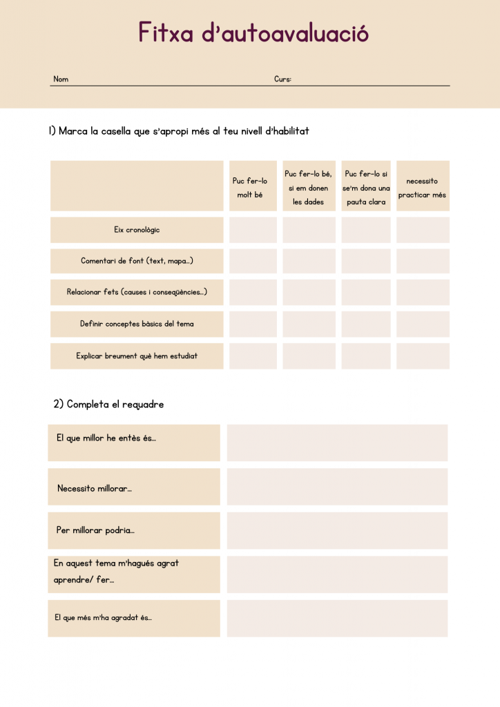 Prendre consciència del propi procés d’aprenentatge per poder regular els esforços, saber què hem aprés i com, així com tenir una visió realista de l’esforç realitzat per assolir els objectius és molt important, però no sempre és fàcil. Per això, utilitzar els documents d’autoavaluació aquí disponibles de forma habitual a l’aula pot ser una gran eina.