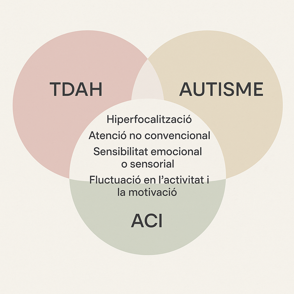 Tot i les diferències, hi ha característques comunes en la forma de processar i interpretar el món entre el TDAH, l’autisme, les Altes Capacitats intel·lectuals, com una capacitat atencional altíssima o hiperfocus en allò que suposa un interès profund (en el cas de l’autisme, més restringits) acompanyat de dificultats atencionals en tasques poc estimulants; així com major sensibilitat emocional i sensorial (és molt habitual que les persones neurodivergents tinguin un Desordre del Processament Sensorial o DPS) .