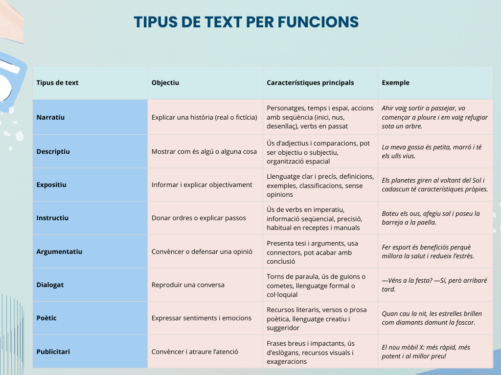 - Segons la seva funció: narratiu, descriptiu, instructiu...
